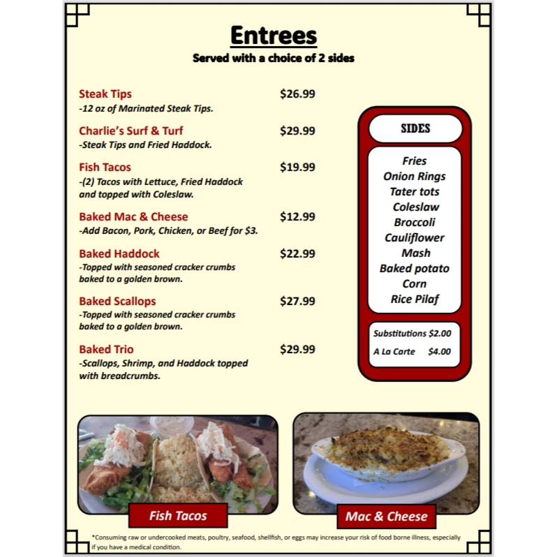 At Charlie’s, the pizza is a must-try, priced at just $9.99, providing fantastic value without compromising on quality. Pair it with extra sides like creamy coleslaw or buttery corn, each for $4.00, to elevate your meal. For those seeking heartier options, explore their delectable dinners, featuring highlights like Baked Haddock and Steak Tips, offering rich flavors for $22.99 and $26.99, respectively.